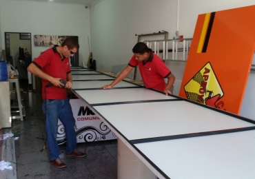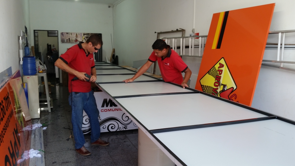 Fachadas com estrutura metálica e revestimento em ACM, Letras Caixa em Aço galvanizado ou PVC, em lona, com impressão digital ou em plotter de recorte eletrônico.